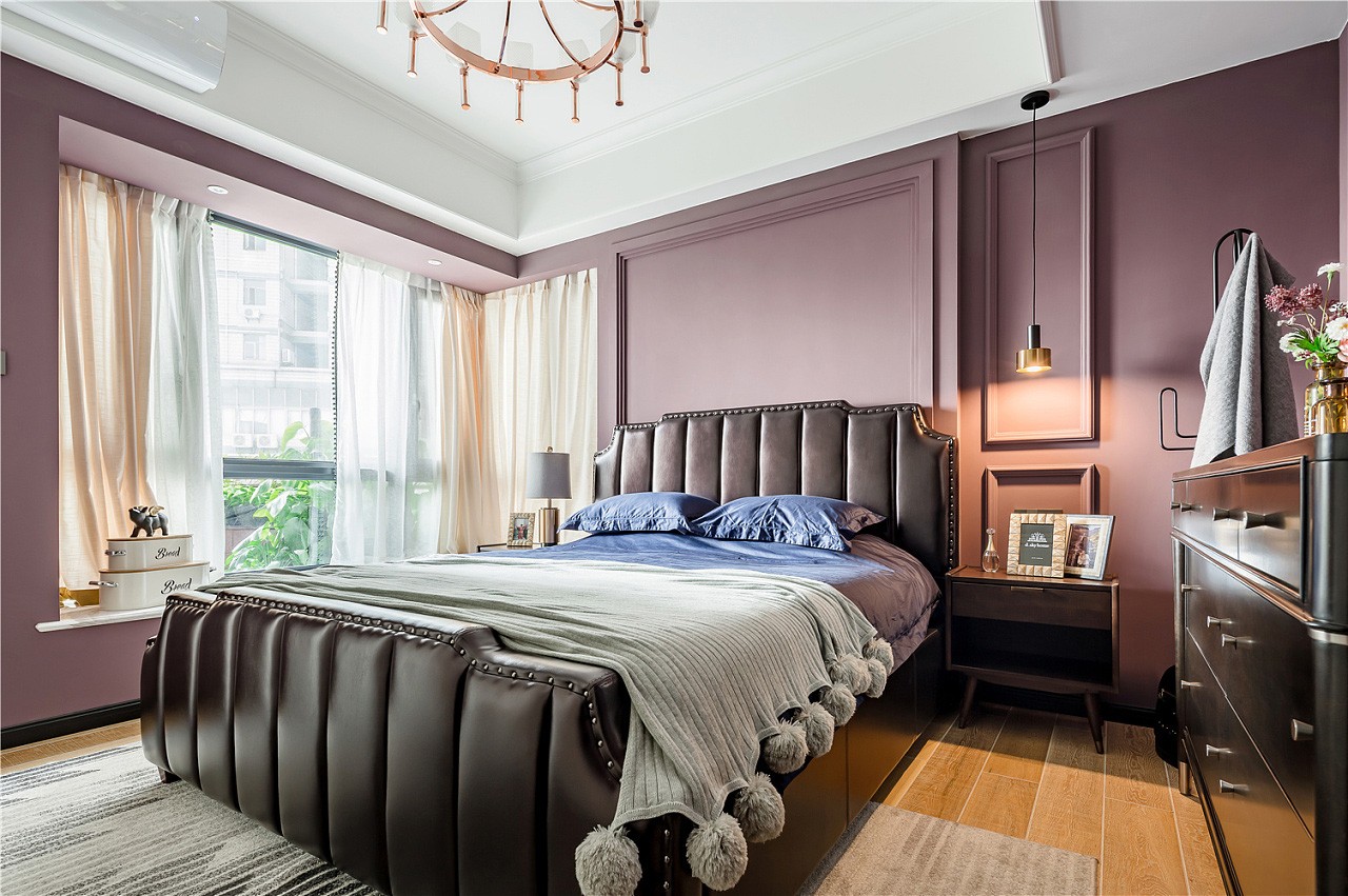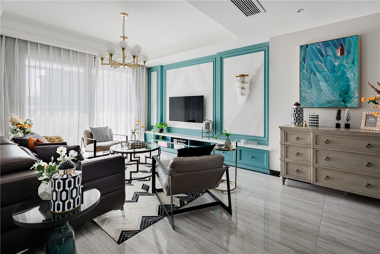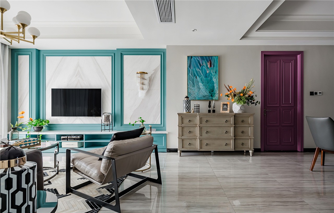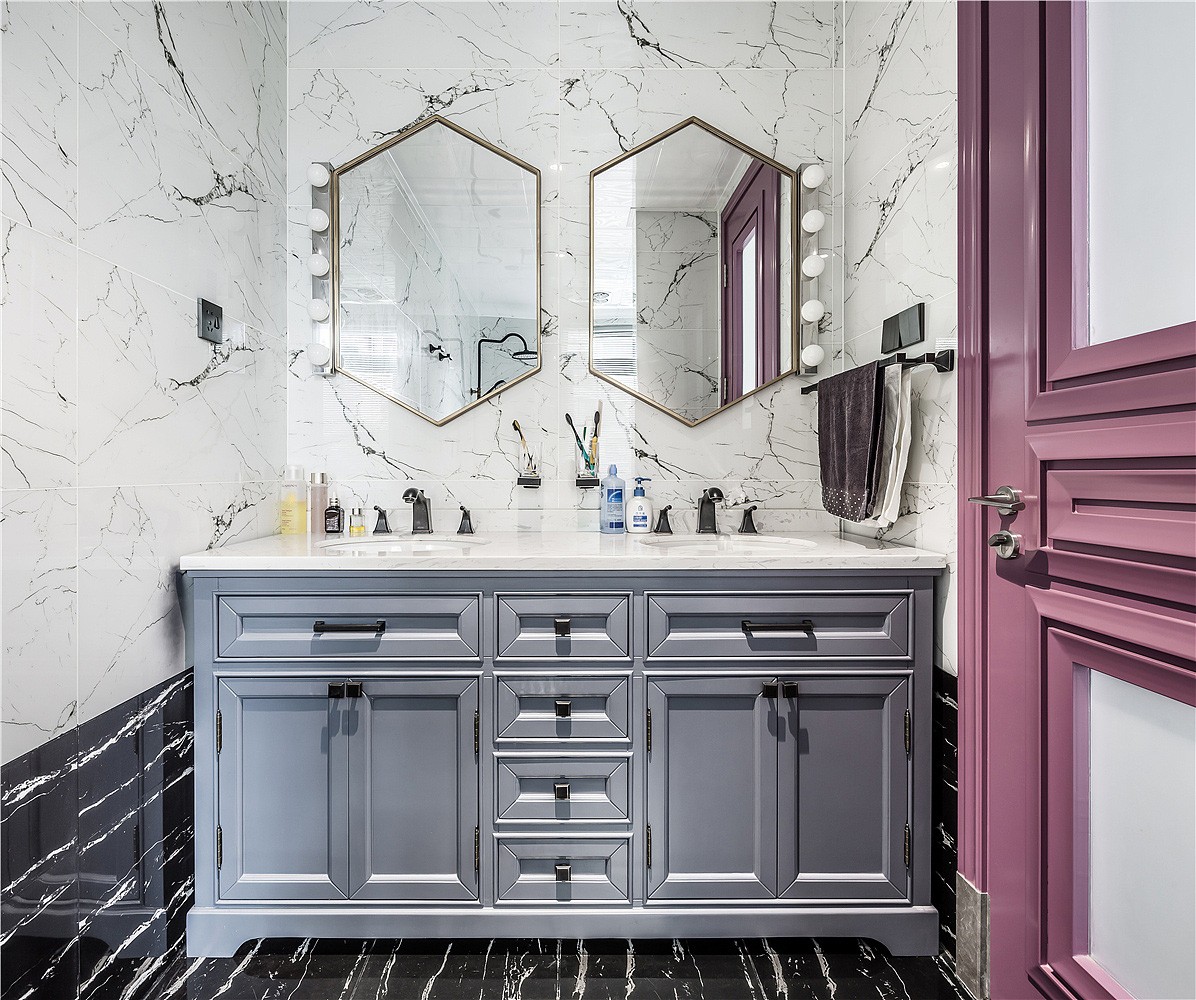 入戶門廳以白色作為基調(diào),紫色門套作為點綴,整體空間驚艷脫俗。地板選用更易清洗、更耐磨損的全瓷磚鋪設(shè),大理石貼墻與地面一起,把客餐廳的整體基調(diào)定在了一個雅字上,典雅大氣。深色的皮質(zhì)沙發(fā)把整個客廳的冷色調(diào)提了起來,像一杯香醇的咖啡,迅速捂暖了大理石的冷硬。主臥室淺棕色、黑色、紫色、白色,四大色塊干凈利落的劃分出主臥的空間層次,床頭細(xì)節(jié)的處理使空間更有縱深感。主衛(wèi)生間銀白龍和爵士白的采用與客廳的整體色調(diào)一脈相承,三種切割成不同大小的瓷磚拼接造型,使小小一方天地也能層次分明。