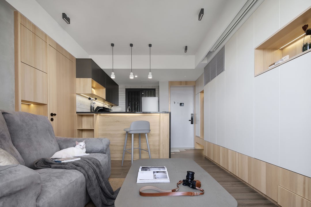 傳統電視柜改為滿墻的收納柜設計,局部的開放柜作為展示,空調做隱藏設計處理,讓空間更加的美觀。