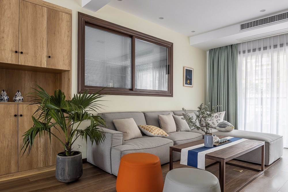 客廳利用半墻加窗戶的形式與書房連接,并在沙發(fā)背景墻左側(cè)利用書房空間做成了儲(chǔ)物柜,將行李箱安置地妥妥的,中部留空的設(shè)計(jì)便于小物件的取放。