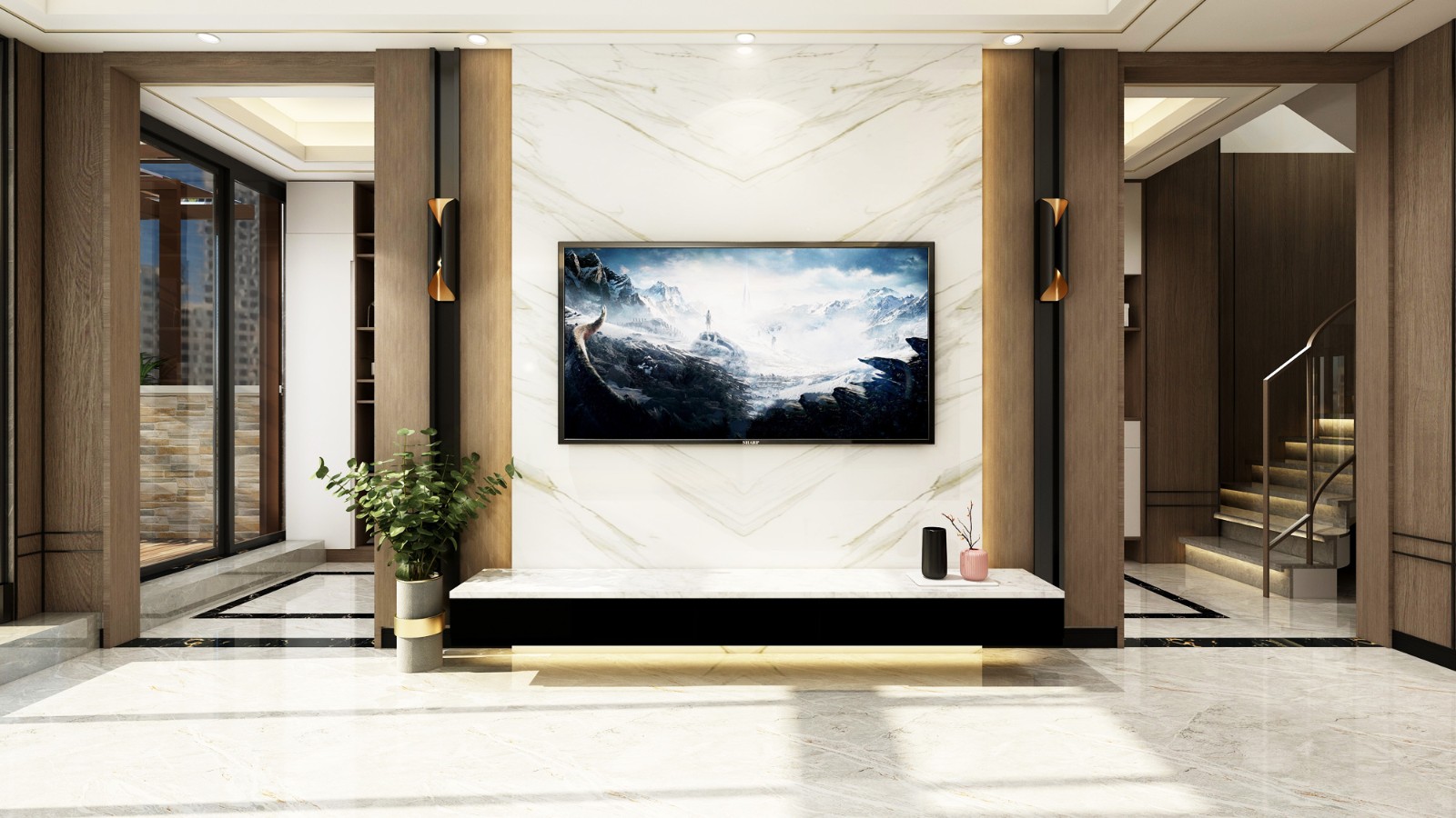 電視背景墻采用滿墻的大理石紋瓷磚,懸空的電視柜,高級(jí)感十足。