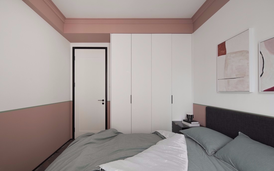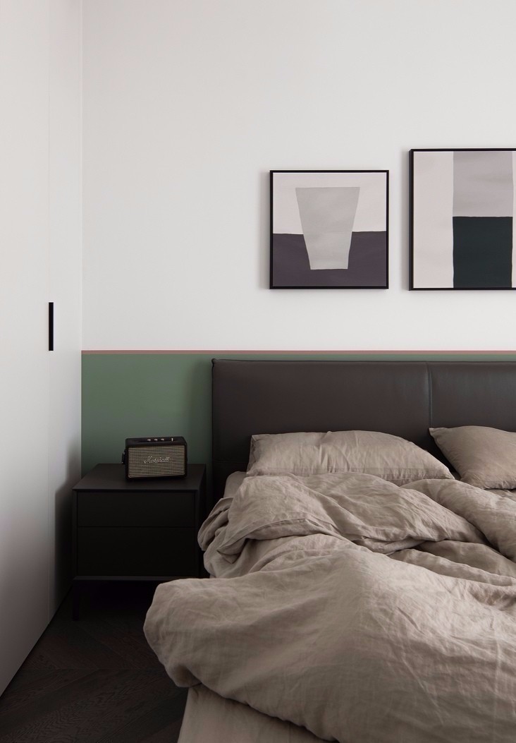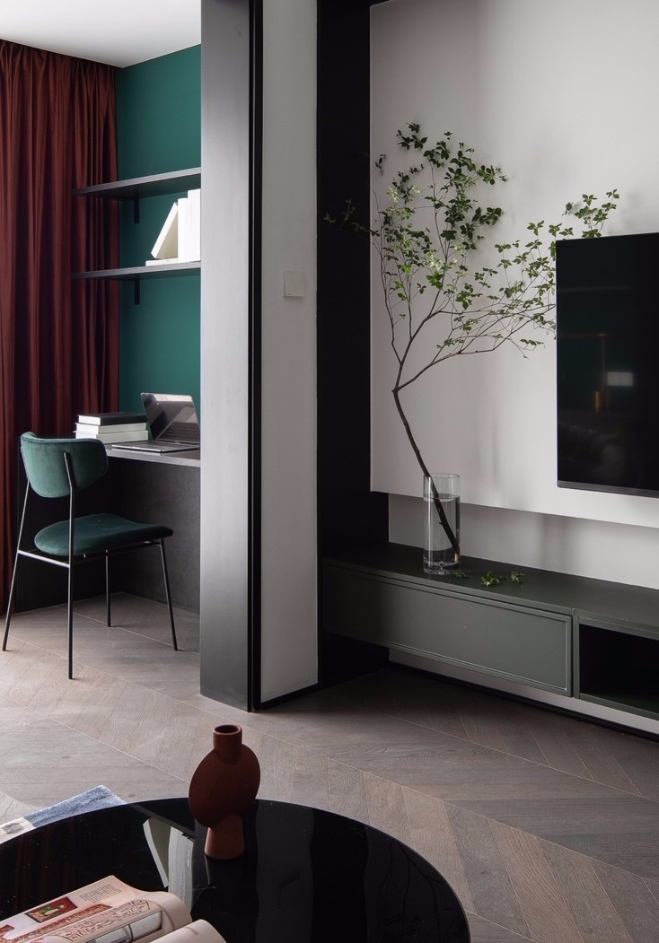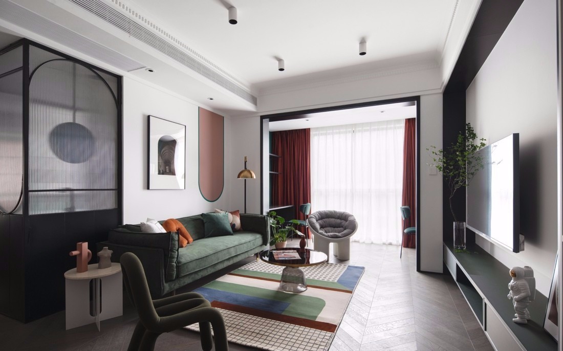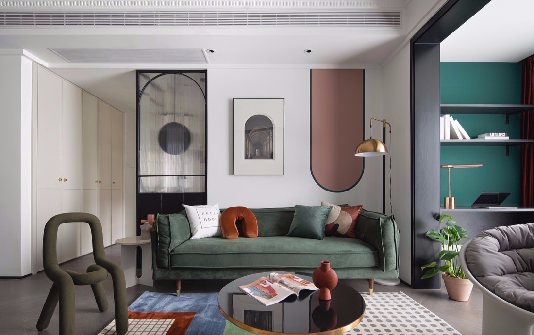 客廳空間以白色為主色調(diào),融入墨綠、酒紅、臟粉等低飽和度彩色,為空間增添了繽紛、動感的視覺效果。