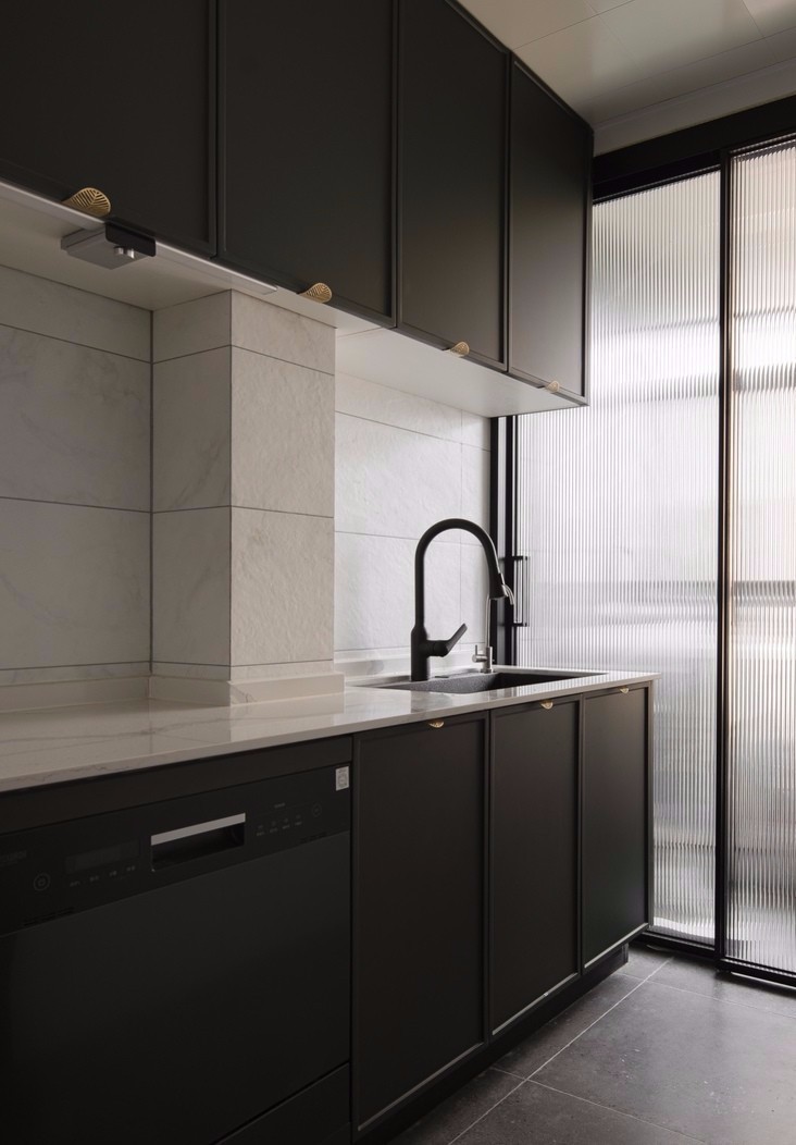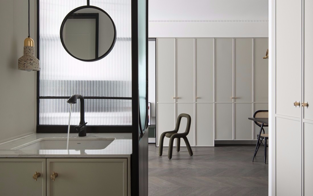 由客廳望向餐廳。客餐廳公共空間以白色為主色調(diào),點綴貫穿全屋的粉和綠。餐邊柜旁的門神,守護陪伴著一家三口,也為這個家注入了更多年輕活潑的元素。